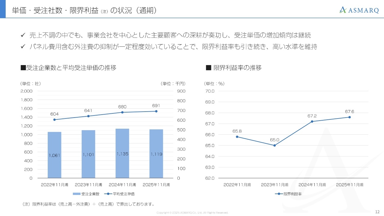 一方で、平均受注単価の上昇トレンドが崩れていない点については、ポジティブな要素と考えています。2025年11月期の平均単価は69万1,000円で、2024年11月期の68万円から微増し、過去最高水準となりました。これは当社が戦略的に注力している事業会社との直接取引において、単なる実査だけでなく、比較や分析といった付加価値の高いサービスを提供できていることの裏付けと考えています。