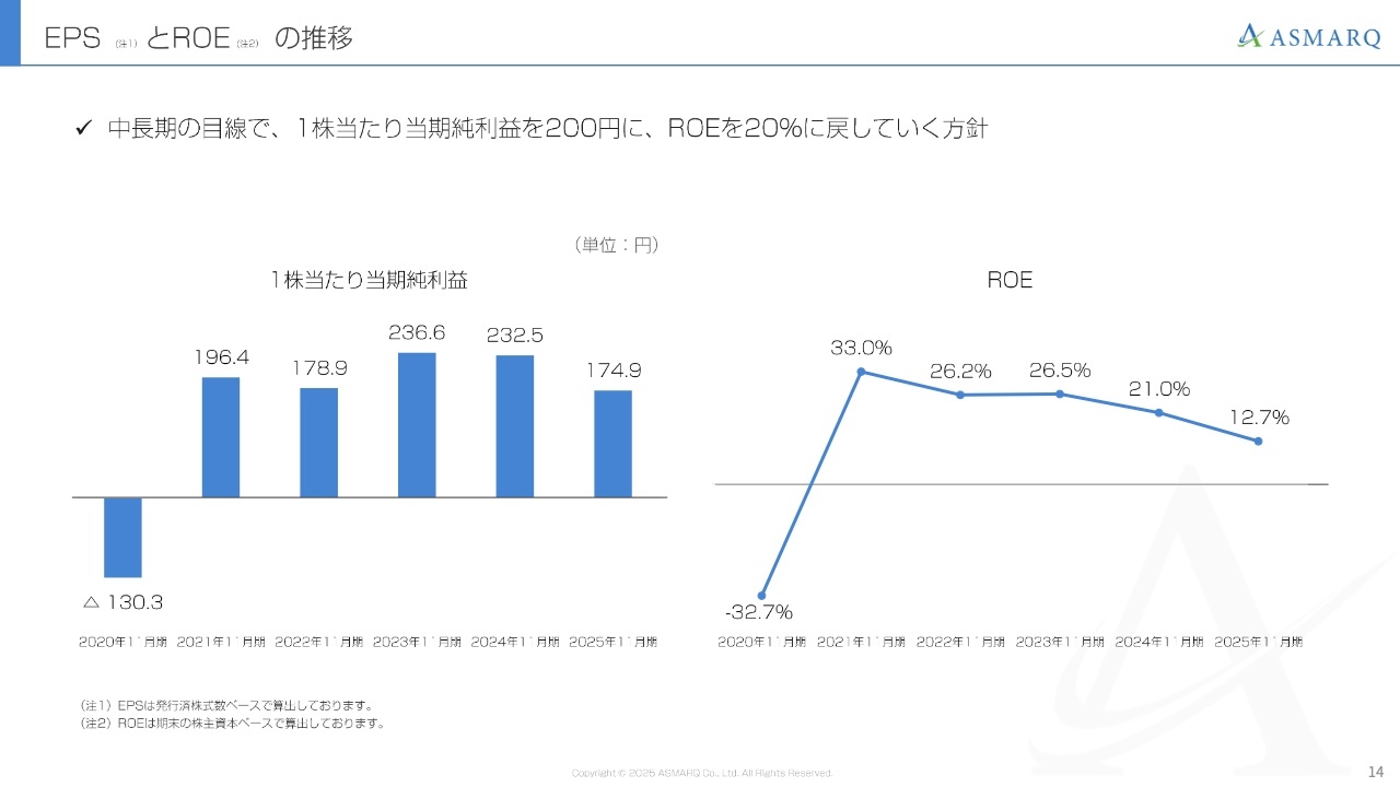 1株当たりの当期純利益(EPS)とROEの状況についてご説明します。先ほどお伝えした減益の影響により、2025年11月期のEPSは174.9円、ROEは12.7パーセントで着地しました。