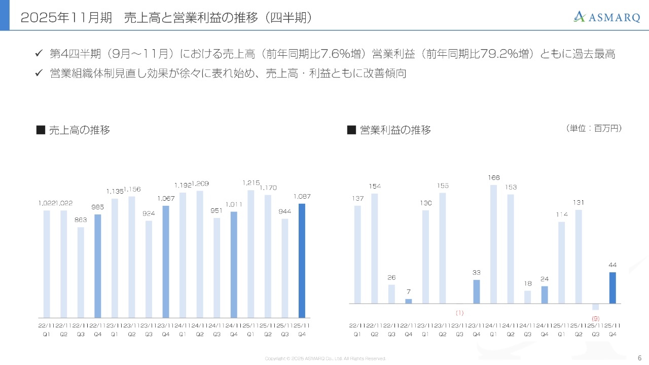 四半期ごとの推移です。スライド左側のグラフが売上高、右側が営業利益を示しています。第4四半期は売上高・営業利益ともに微増ながら過去最高となりました。
