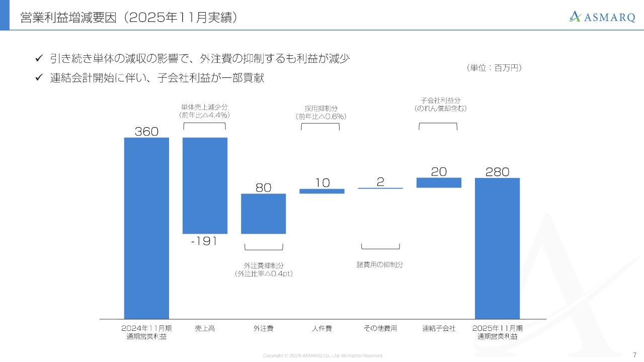 今回、営業利益が前年比で22.2パーセント減少した内訳ですが、単体の売上高が前年に比べて4.4パーセント減少し、1億9,100万円のマイナス影響があったことが大きな要因です。外注費については、外注比率が0.4ポイント改善され、前年に比べて8,000万円抑制されるというポジティブな要素があったものの、売上減少の幅を取り戻すには至りませんでした。