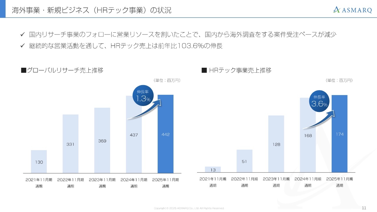 営業体制の見直しを含め、事業構造そのものを変えることを目的に、例えばリサーチ分野ではグローバル展開に注力する方向で進めたり、HRテック事業やM&Aの準備を同時並行で進めたりしてきました。その結果、ここ2期は売上が横ばいとなっていますが、2026年11月期は売上高47億円を目標に、再び成長軌道に乗せることを目指しています。