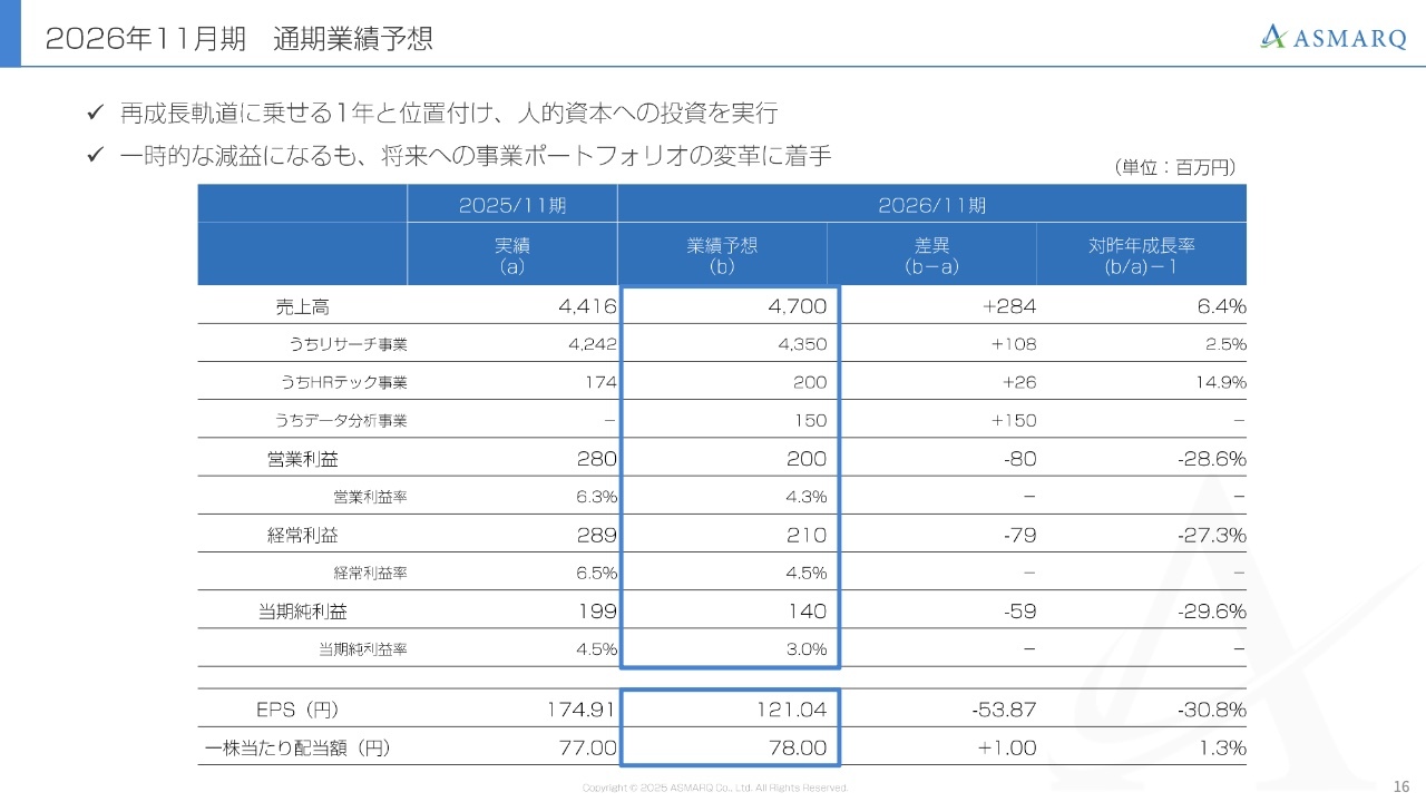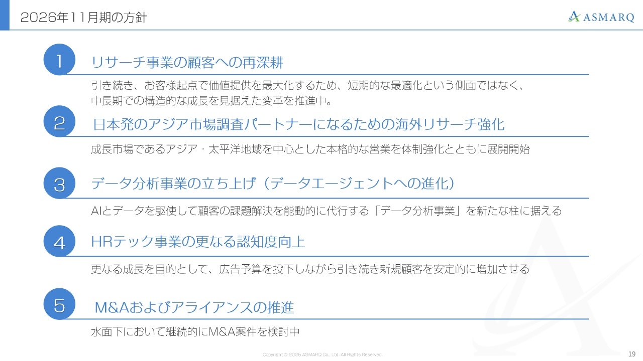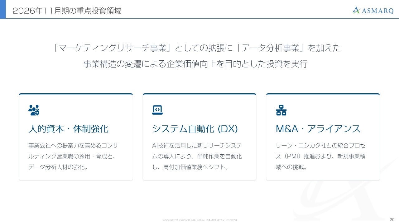 マーケティングリサーチ事業、HRテック事業、データ分析事業において、来期以降の成長を見据え、積極的な投資とアクションを実行していきます。そのため、2026年11月期は一時的に利益が若干減少する見込みですが、これは来期以降の成長に向けた必要な投資として進めていきます。