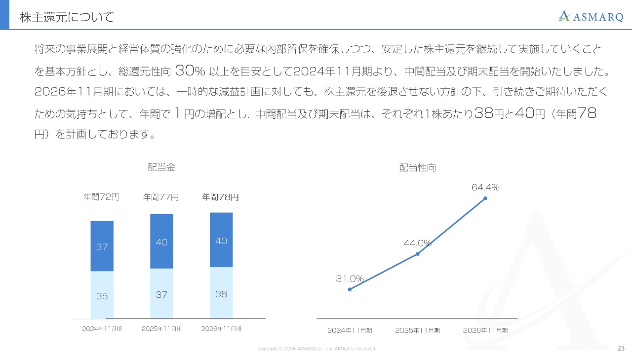飯田:2026年11月期における株主還元についてご説明します。町田からもご説明したとおり、将来的な飛躍的成長に向けて、今期は変革と投資の年と位置づけています。今期は減益となる計画ではありますが、事業の基礎体力は着実に向上していると考えています。