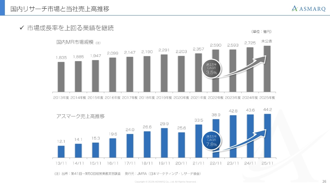 スライド下段のグラフは、当社の売上高推移です。過去5年間における国内のマーケティングリサーチ業界全体の年平均成長率は3.5パーセントである一方、当社の売上高は直近で伸び悩みはあるものの、過去5年間の年平均成長率は7.8パーセントに達しました。