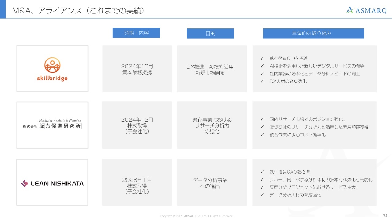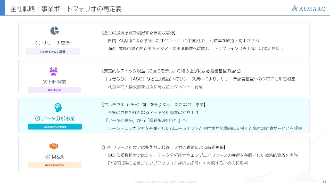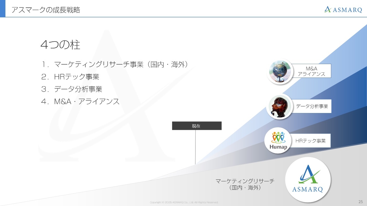 マーケティングリサーチ事業を全社の投資原資を創出する安定的な収益源と位置づけるとともに、データ分析の領域では将来的な成長のけん引役として、AIデータエージェントの地位を確立したいと考えています。そこにM&A効果が加わることで、これまでの延長線上を超えた非連続的かつ飛躍的な成長を実現したいと考えています。