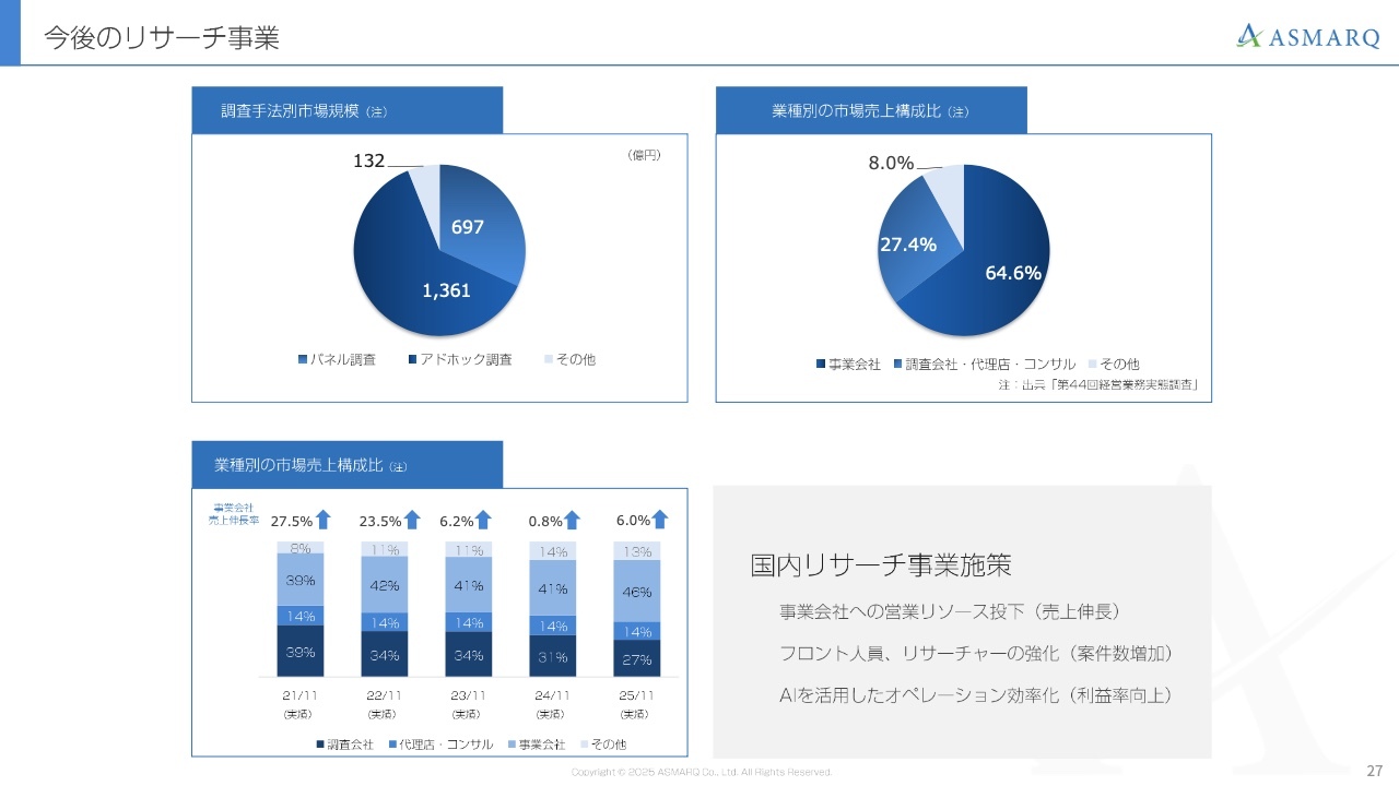 調査会社からのパネル借りの需要減少は業界全体で見られる傾向であり、ある程度は構造的な変化であると捉えています。一方で、当社はエンドクライアントである事業会社との直接取引拡大に注力してきた結果、事業会社向けの売上は過去最高を記録して、売上構成比でも46パーセントまで拡大しました。