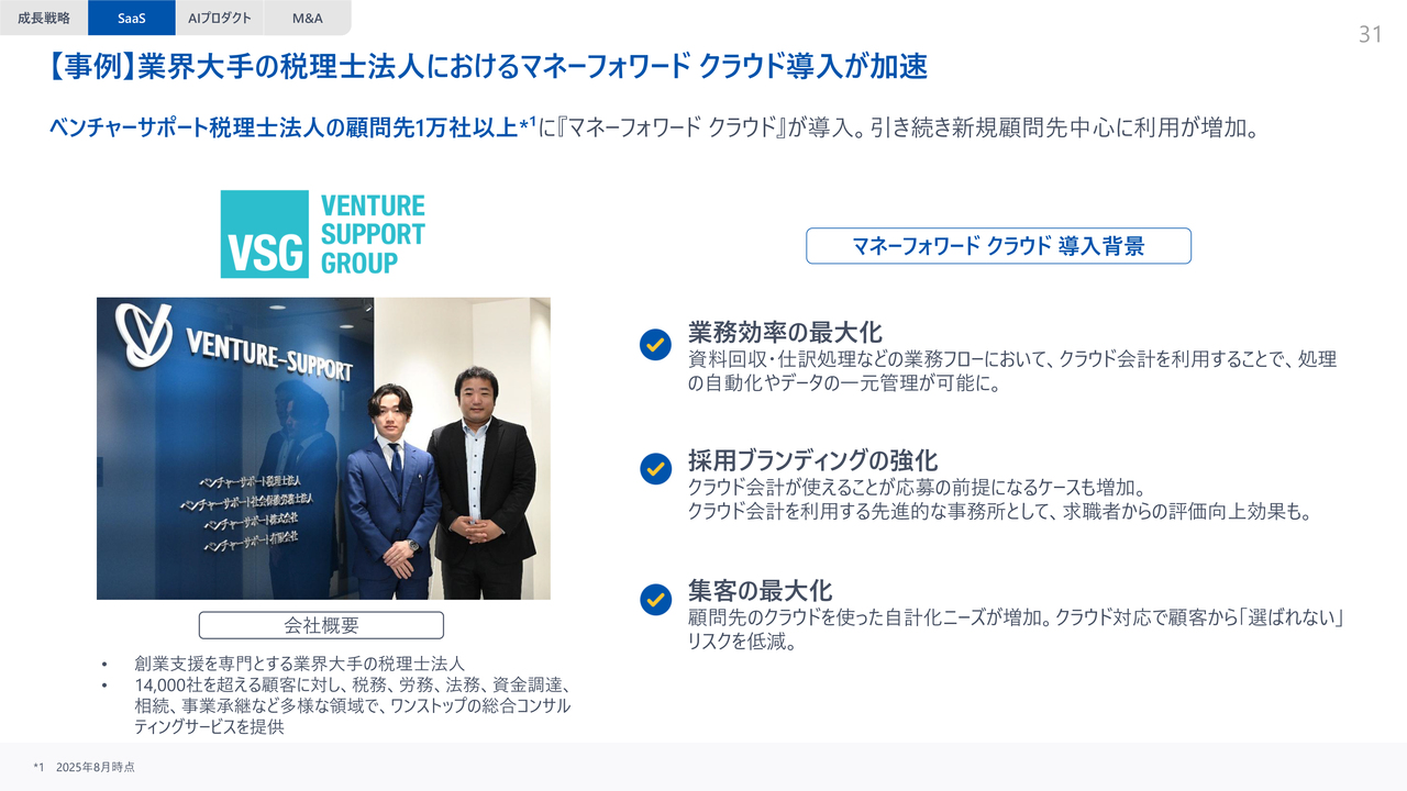 次に、会計事務所さまの事例をご紹介します。SMB領域において、ベンチャーサポート税理士法人さまは業界最大手の1社であり、2022年から当社の公認メンバーとしてご参加いただいています。