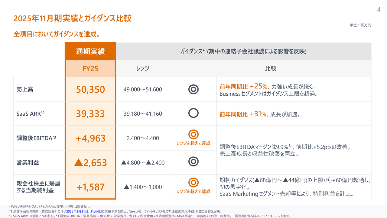 通期実績とガイダンスの比較についてご説明します。売上高、SaaS ARR、調整後EBITDA、営業利益、当期純利益のすべてにおいて、ガイダンスを達成またはレンジ上限を超過して達成しています。