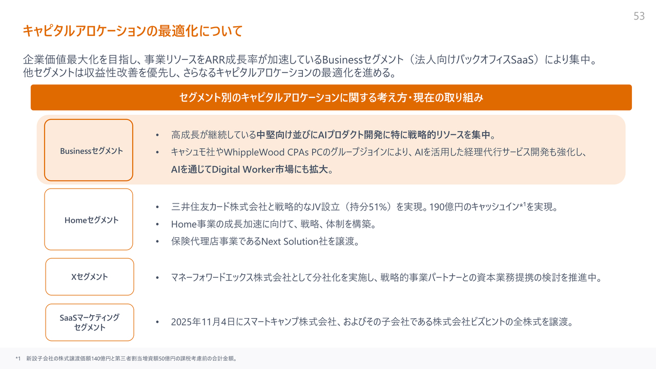 キャピタルアロケーションの最適化では、Money Forward Businessセグメント、特にAI投資へのリソース集中を目的として、Money Forward SaaS Marketingセグメントにおけるスマートキャンプ社の売却を実施しました。