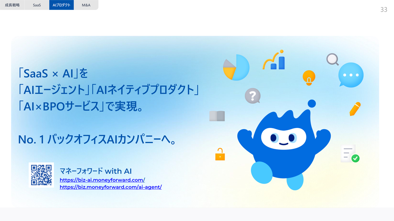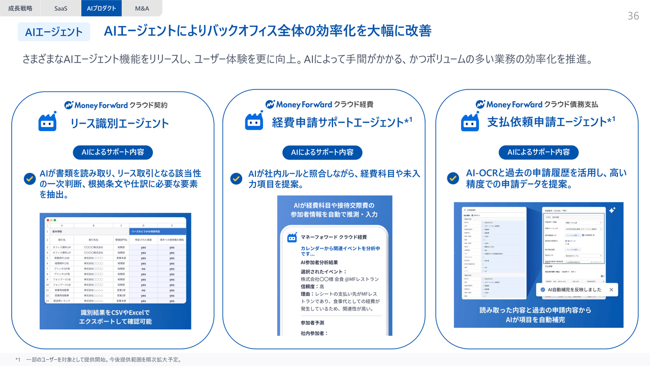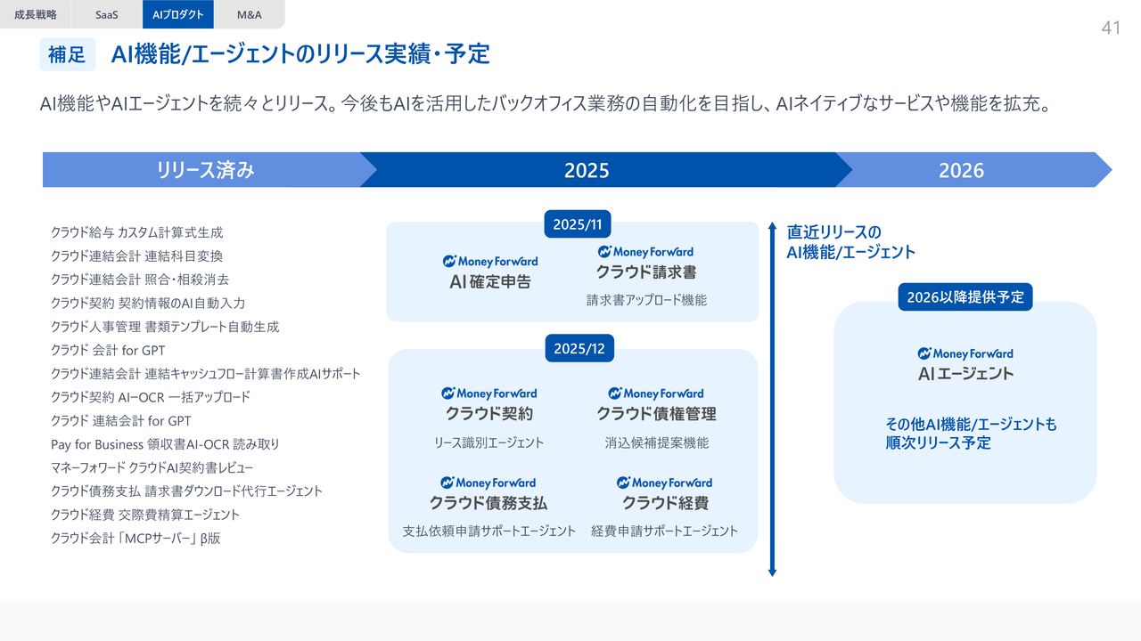 また、AIネイティブプロダクトとして「AI確定申告」やデジタルワーカー向けの「マネーフォワード おまかせ経理」をリリースするなど、AI活用の取り組みを加速させています。詳細については後ほどご説明します。