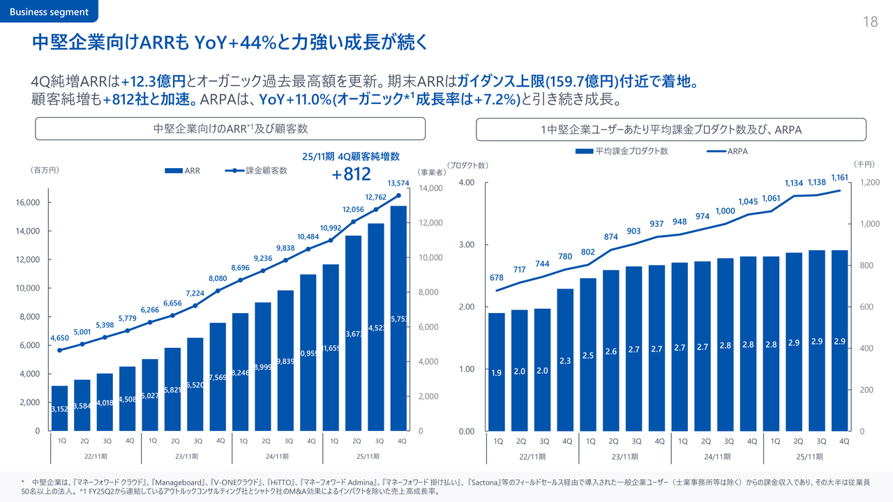 中堅企業についてです。中堅企業向けのARRは150億円規模を超え、前年同期比44パーセント増と、引き続き力強く成長しています。ARPAも前年同期比11パーセント増と順調に拡大しており、複数のプロダクト利用拡大や大口顧客の獲得により、単価向上が続いています。
