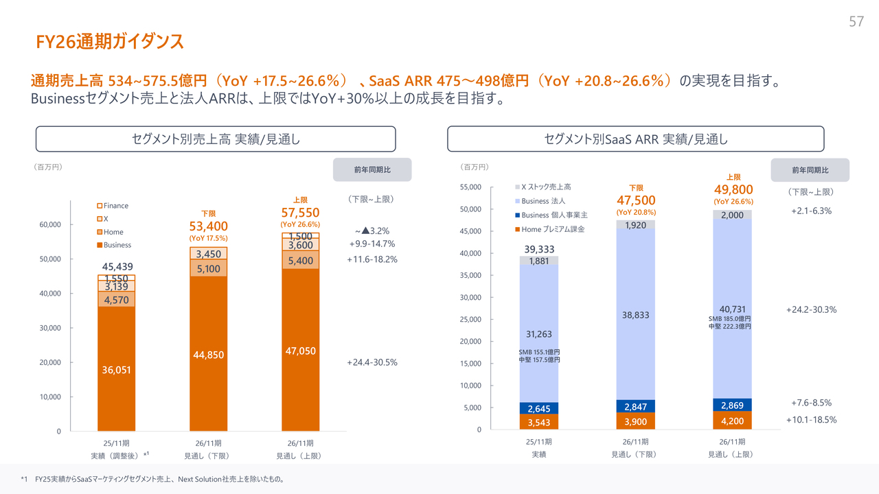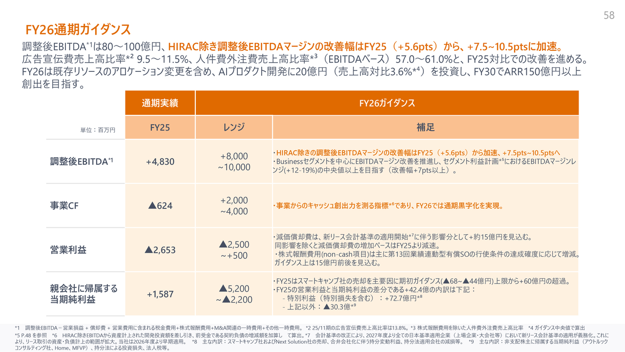 FY2026の業績予測では、通期の事業キャッシュフローを黒字化し、20億円から40億円の創出を目指します。また、AIへの投資を継続しつつ、EBITDAマージンの改善を加速させる方針です。売上高成長率は上限レンジを26.6パーセント、SaaS ARRも同様の上限レンジでの成長を見込みます。法人ARRは上限レンジを30.3パーセントとして、成長を目指します。