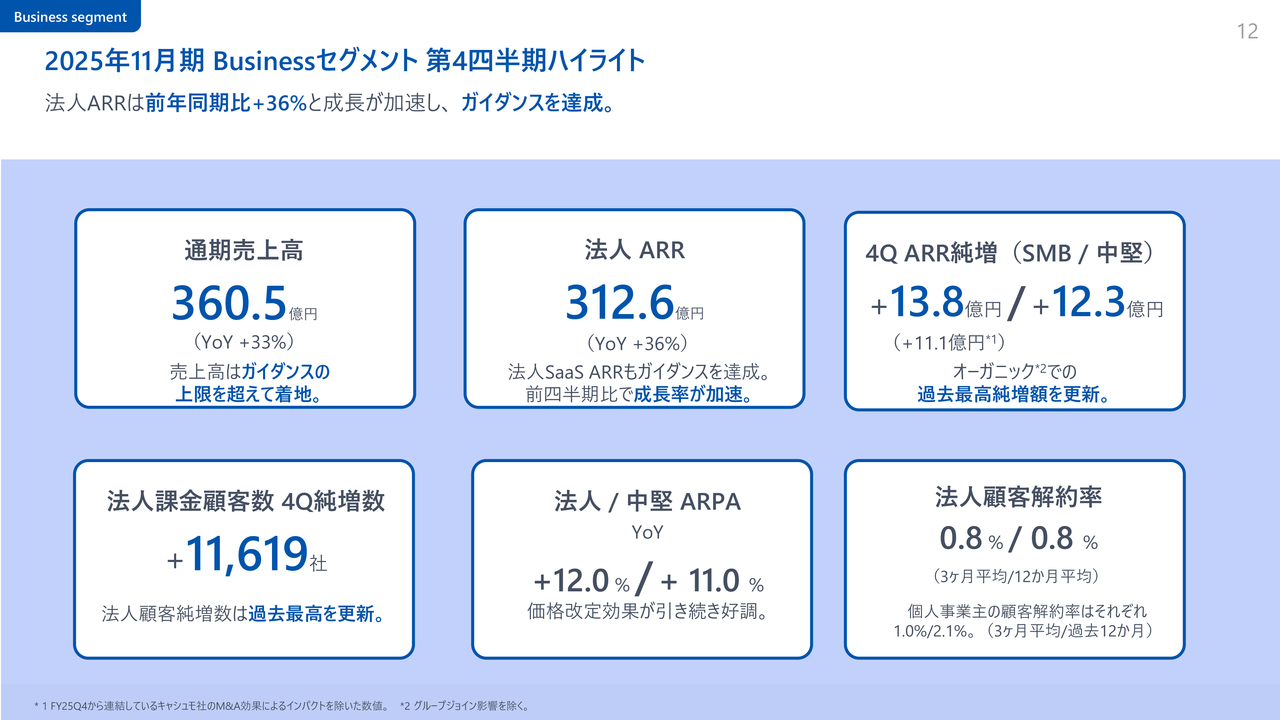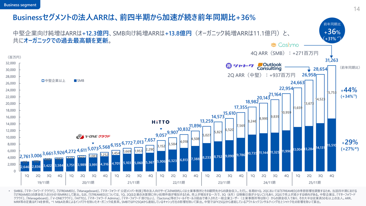 特にMoney Forward BusinessセグメントではSMBおよび中堅向けにおいて、第4四半期に過去最高のオーガニックARR純増を記録し、前年同期比34パーセント増と、分母が拡大する中でもさらに成長を加速しています。