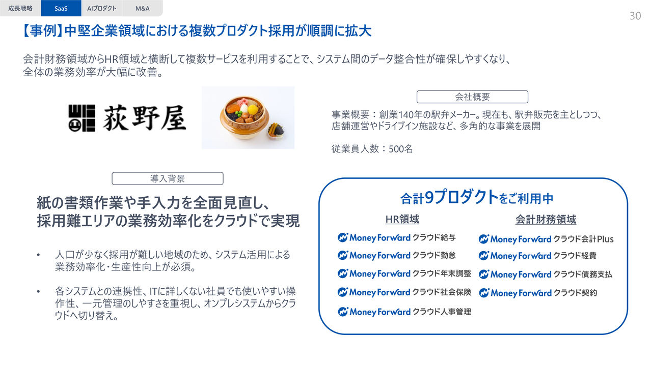 具体的な事例として、荻野屋さまをご紹介します。荻野屋さまは、もともとオンプレミスソフトをご利用されていましたが、現在は当社の9つのプロダクトをご利用いただいています。