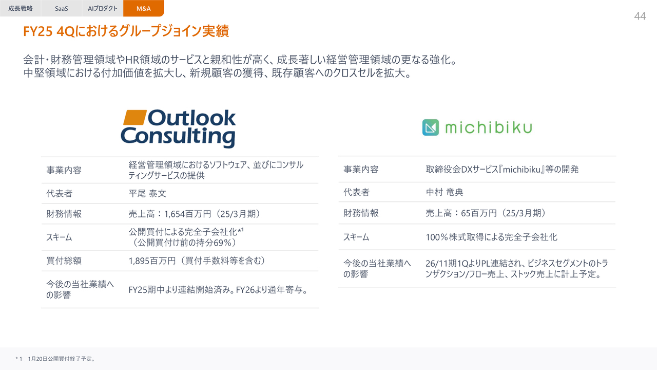 第3四半期では、もともと69パーセントの持分を保有していたアウトルックコンサルティング社の公開買付による完全子会社化を進めています。1月20日に終了予定です。