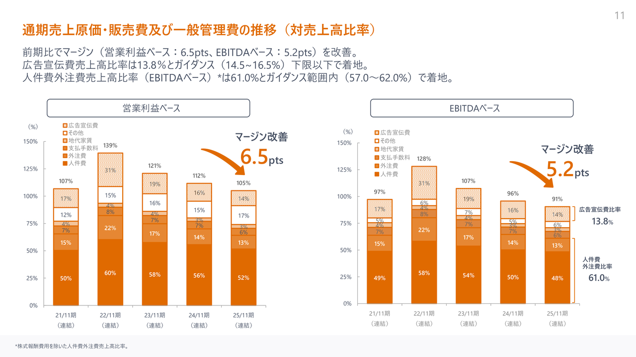 人件費・外注費比率は61パーセントで、ガイダンス範囲内に収まりました。このどちらの主要項目においても、成長を維持しつつ規律ある水準でコントロールできたと考えています。