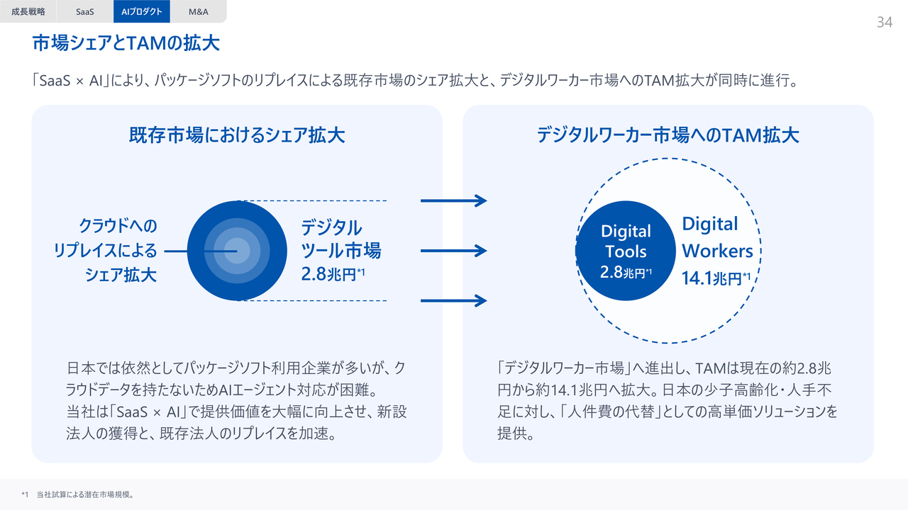 「SaaS×AI」は、当社の市場シェアやTAM(総潜在市場)を大きく拡大できると考えています。スライド左側には、クラウドおよび既存市場におけるシェア拡大を示しています。AIが機能するためにはデータが必要であり、データにアクセスしてオンライン化することが求められます。そのため、クラウド環境でのみ可能なAIによる効率化や省人化、さらにはユーザーへの付加価値が広がることで、既存のパッケージソフトウェアのリプレイスが加速すると考えています。
