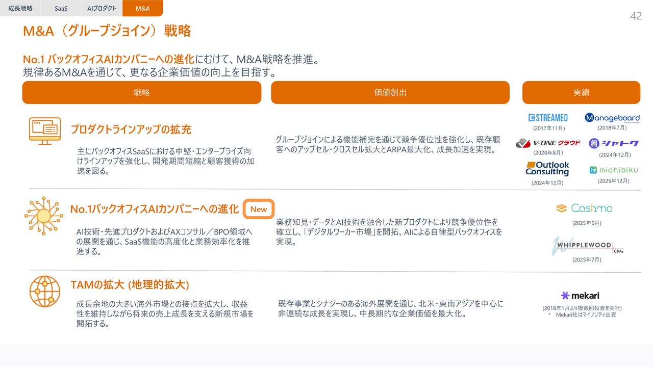 成長戦略の3つ目であるM&A戦略です。これまでと同様に、プロダクトラインナップの拡充やTAMの拡大を目的としたM&Aを推進しています。