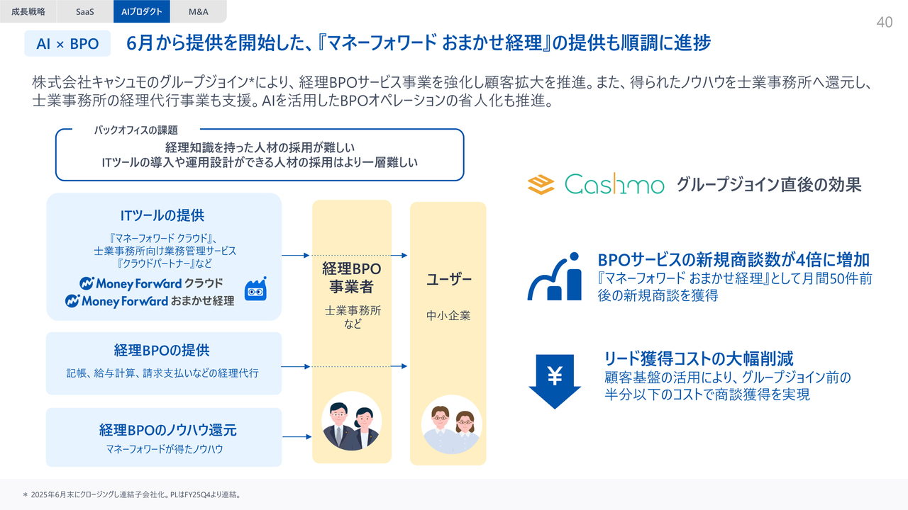 前回の決算でもお伝えしましたが、6月より経理代行サービスを展開するキャシュモ社がグループジョインしました。サービス提供は非常に順調に進んでおり、BPOサービスの新規商談数が4倍に増加し、リード獲得コストが大幅に削減されるという効果がすでに出ています。