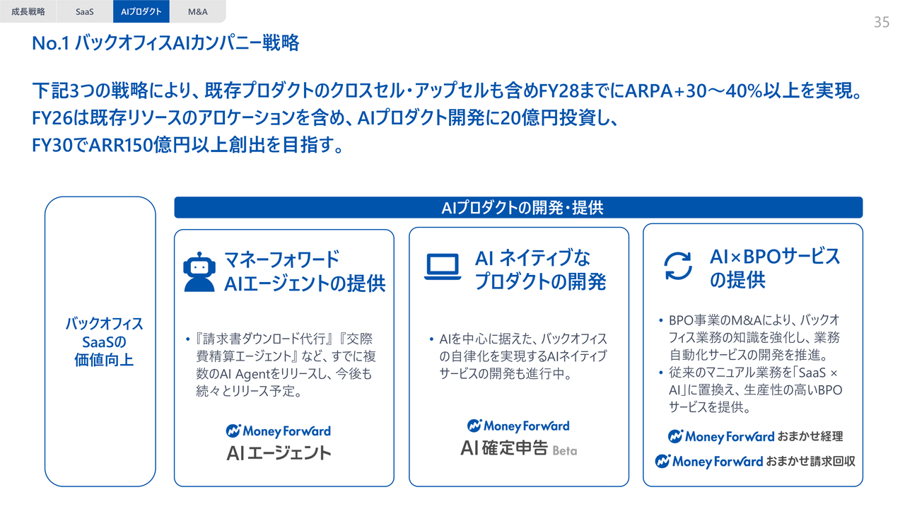 スライドに示しているのがその3つの柱です。「SaaS×AI」の3つの戦略を推進することで、既存プロダクトのクロスセルやアップセルも含めて、FY2028までにARPAを30パーセントから40パーセント以上に向上させたいと考えています。