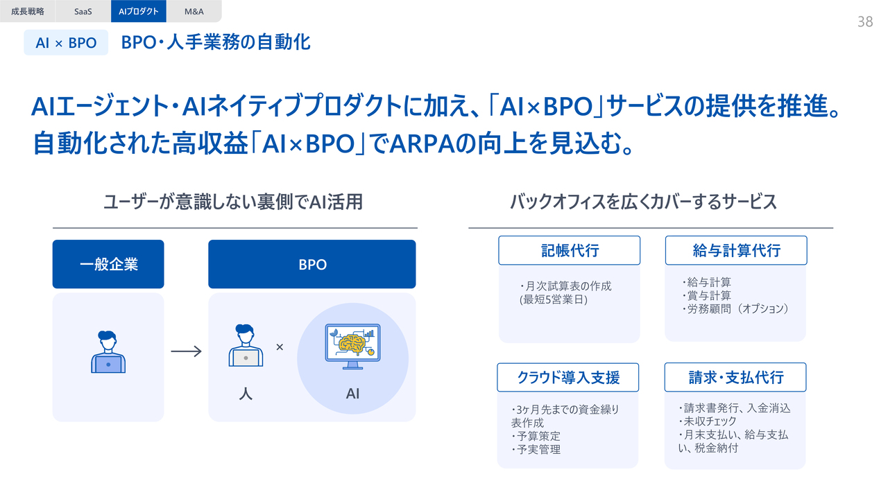また、「No.1 バックオフィスAIカンパニー」という全体戦略に沿って、M&Aを進めています。例えば、キャシュモ社はその一例です。AIを活用した競争優位性の確立やデジタルワーカー市場の開拓を目指し、こうした事業をM&Aで取り入れながら、オペレーションの改善を進めています。