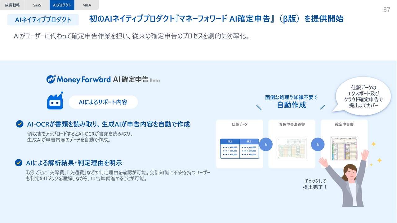 2つ目は、当社のAIネイティブプロダクトです。このたび、当社初のAIネイティブプロダクトとして「マネーフォワード AI確定申告」の提供を開始しました。これは、会計知識がまったくないユーザーでも、AIが領収書を1つの画面で読み取り、申告内容のデータを自動で作成するものです。