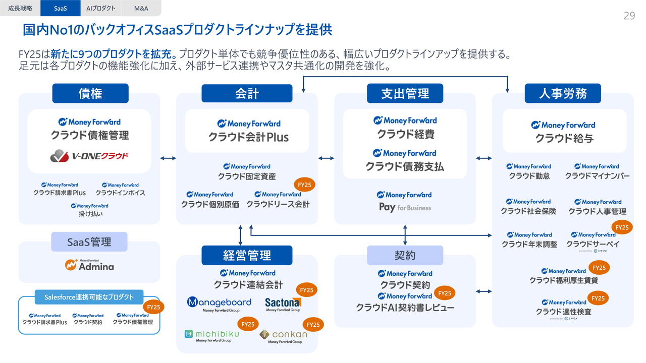 FY2025には9つの新たなプロダクトを提供しました。また、自社プロダクトに限らず、外部サービスとの連携やマスター統合などの開発強化も進めています。