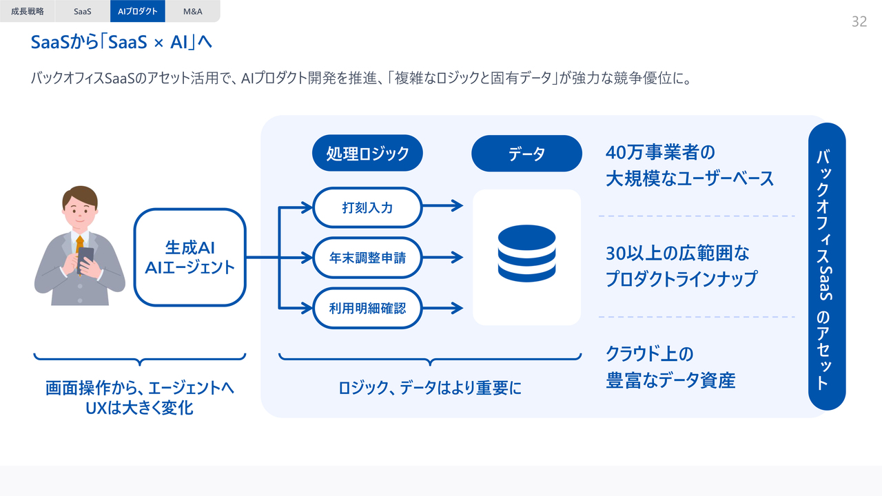 「SaaSから『SaaS×AI』へ」と記載していますが、これまではお客さまがSaaSプロダクト上で直接操作するUXが主体でした。今後はこれが、AIによる自律的な操作に置き換わっていくと考えています。SaaS上で操作できる範囲が、そのままAIが自律的に操作できる範囲に移行していくということです。