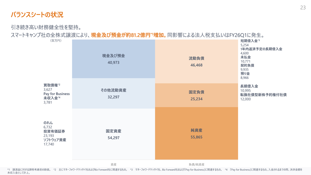 バランスシートとキャッシュの状況です。スマートキャンプ社の売却は11月4日にクロージングし、この影響で現預金が約80億円増加しました。なお、この税金の影響は第1四半期に発生予定です。
