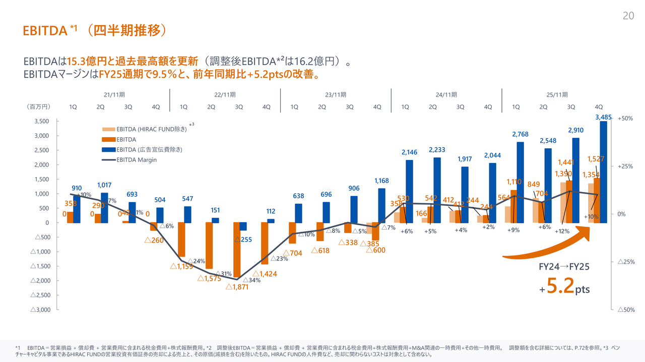 EBITDAの四半期推移です。第4四半期は15億3,000万円、調整後EBITDAは16億2,000万円となり、好調な売上高や効率的なマーケティング費用の活用により、四半期ベースで過去最高を達成しました。