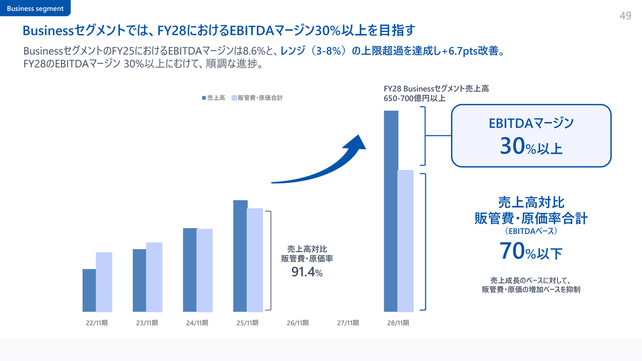 Businessセグメントでは、FY28におけるEBITDAマージン30%以上を目指す