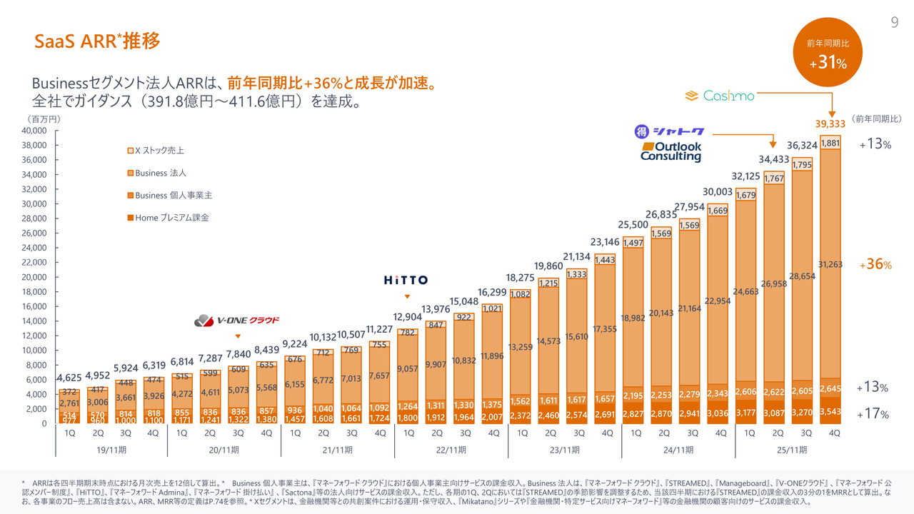 SaaS ARRです。前年同期比31パーセント増となり、そのうち法人ARRが前年同期比36パーセント増と成長を牽引しました。期初に掲げたARRガイダンスも達成しています。