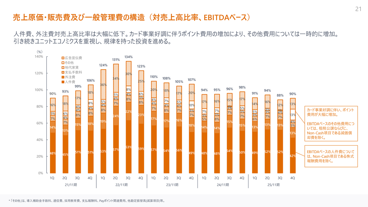 コスト構造の比率です。第4四半期はカード事業の売上が大きく伸びた影響で、コスト構造の比率に一時的な変化が見られました。具体的には、人件費の比率が大きく低下する一方で、カード事業関連の費用が増加しました。