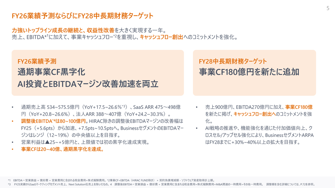 FY2026の業績予測ならびに中長期財務ターゲットです。引き続きトップラインの力強い成長を継続し、収益性改善を実現する1年とするべく取り組んでいます。売上高やEBITDAに加え、事業キャッシュフローを重視し、キャッシュフロー創出へのコミットメントを強化します。
