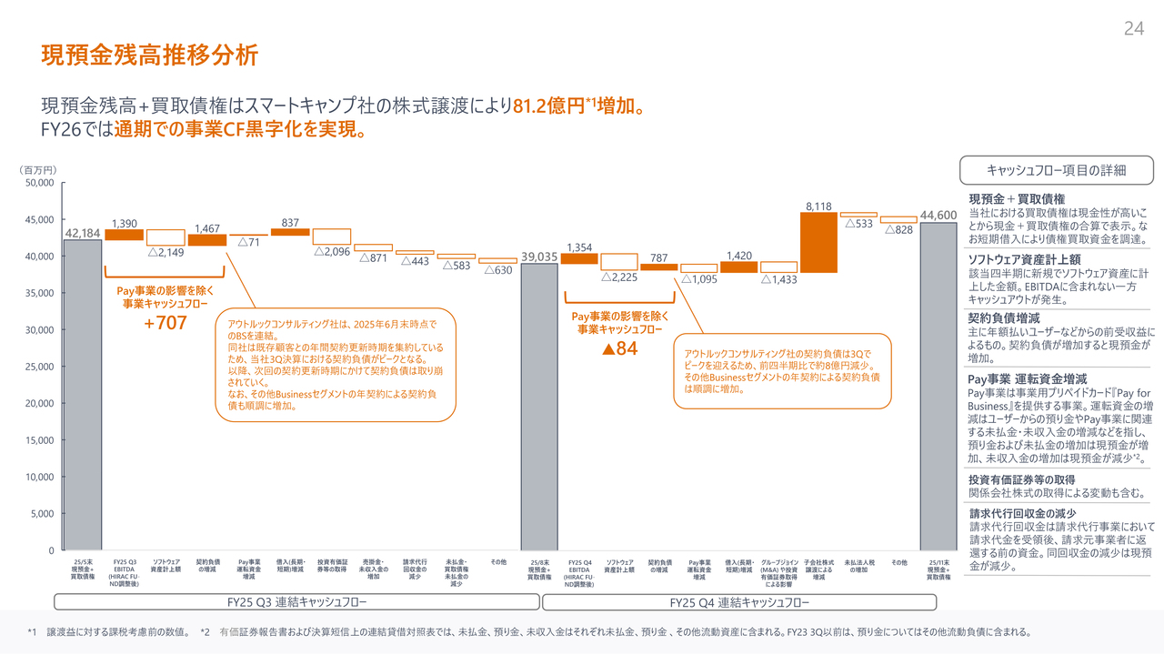 事業キャッシュフローです。前回の第3四半期でもお伝えしたとおり、契約負債は第3四半期にピークを迎えており、これはアウトルックコンサルティング社の契約更新タイミングによるものです。