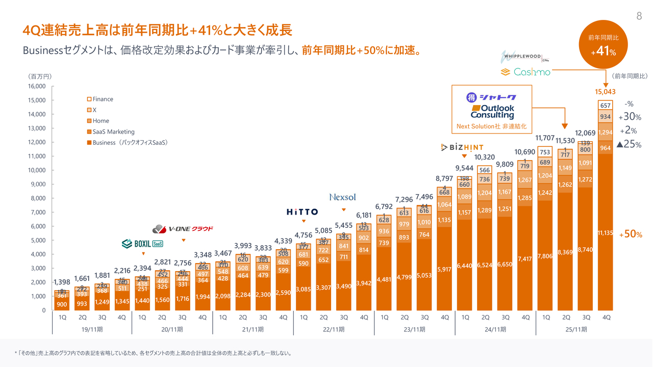 4Q連結売上高は前年同期比+41%と大きく成長