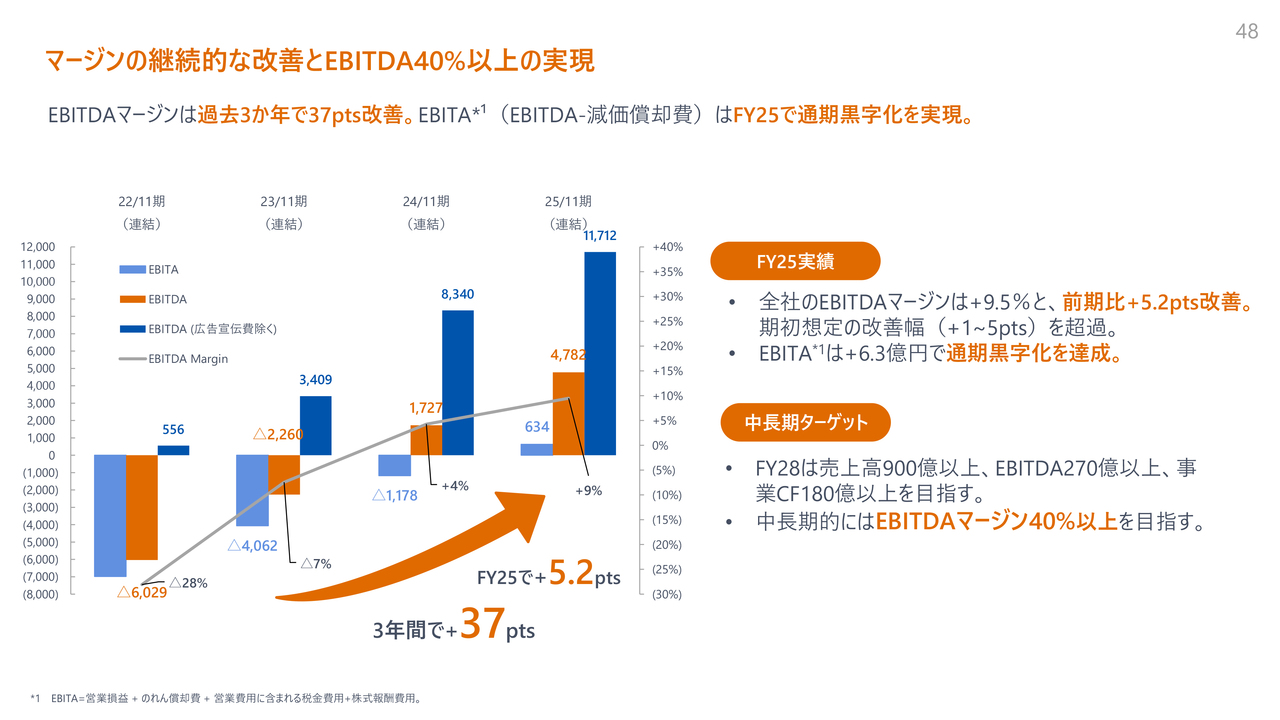 EBITDAマージンの拡大および改善について説明します。過去3年間でEBITDAマージンは37ポイント改善し、FY2025では前期比5.2ポイントの改善を見込んでいます。中長期的には、EBITDAマージンを40パーセント以上にすることを目指しています。