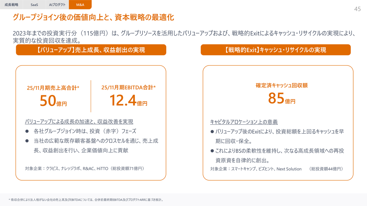 スライド右側はキャッシュ・リサイクルの実現について記載しています。具体的には、スマートキャンプ社やNext Solution社などが該当します。これらは、当社グループに加わりバリューアップを行った後にExitすることで、次なる高成長領域への再投資を可能とする仕組みです。投資総額は44億円であり、投資総額を大きく上回る約2倍のキャッシュを回収しています。