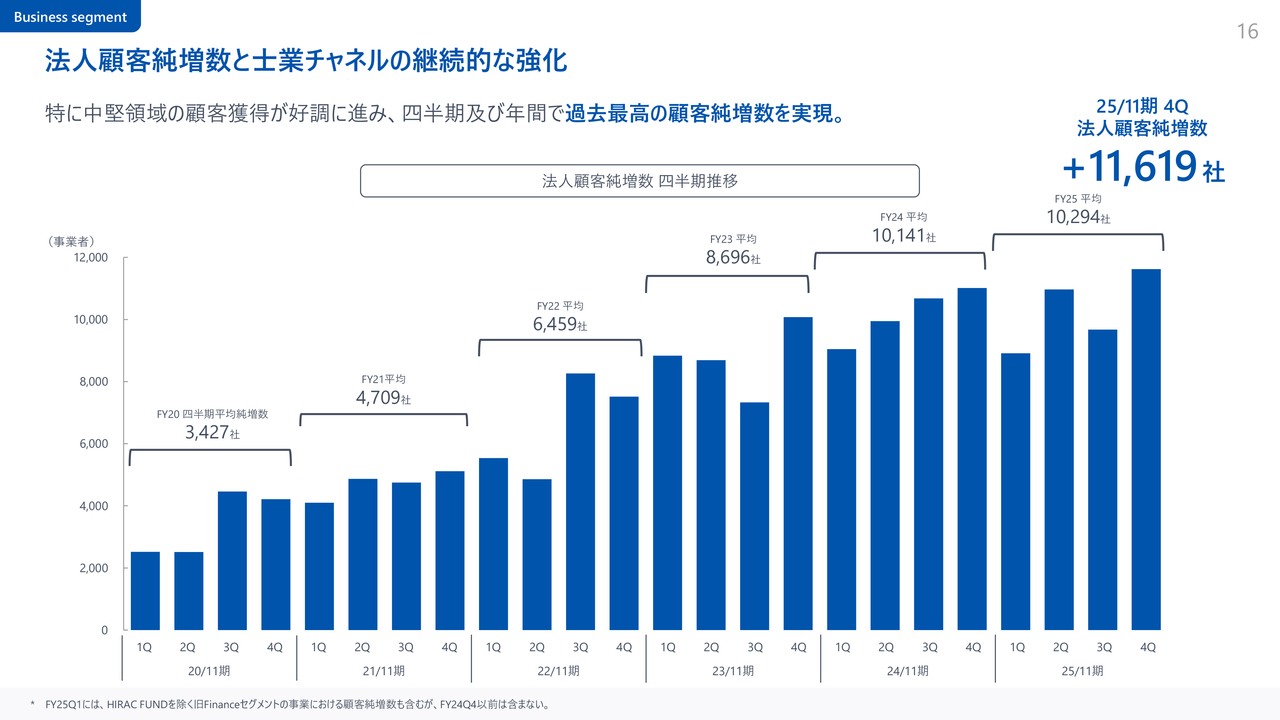 法人課金顧客純増数についてご説明します。第4四半期は1万1,000社を超え、過去最高を達成しました。年間の顧客純増数も昨年を上回りました。