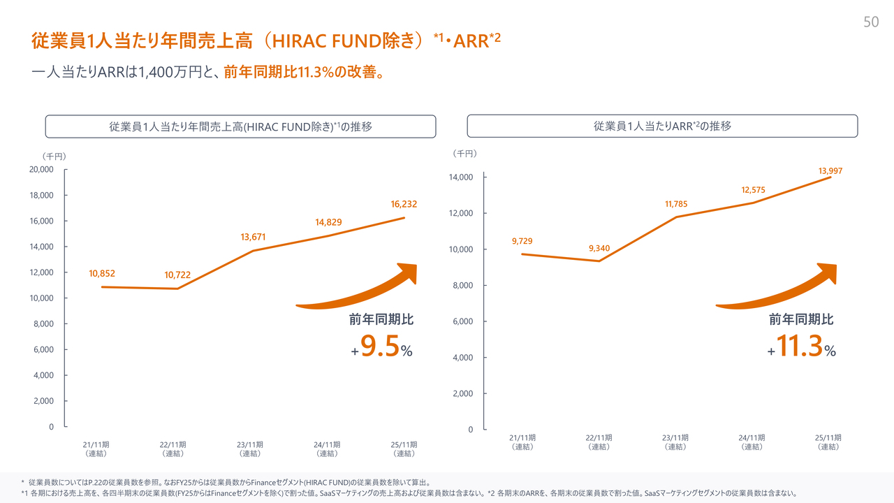 従業員1人当たりの年間売上高は、前年同期比で9.5パーセント増加し、ARRは前年同期比11.3パーセント増加と順調に改善しています。