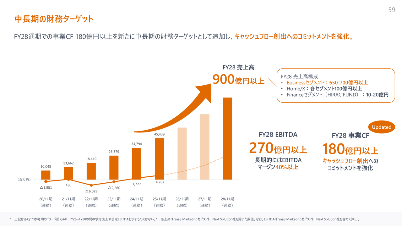 あわせて、FY2028に向けた中長期財務ターゲットとして、事業キャッシュフロー180億円を新たに追加しました。FY2028に向けて、売上高900億円、EBITDA270億円、事業キャッシュフロー180億円を目標に設定し、安定的にキャッシュフローを創出することをコミットします。