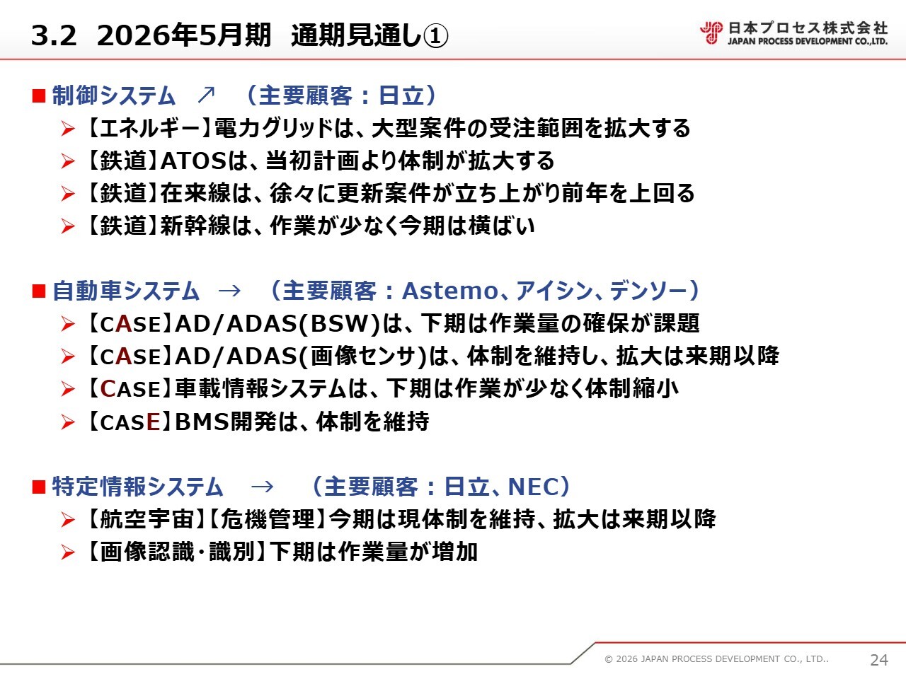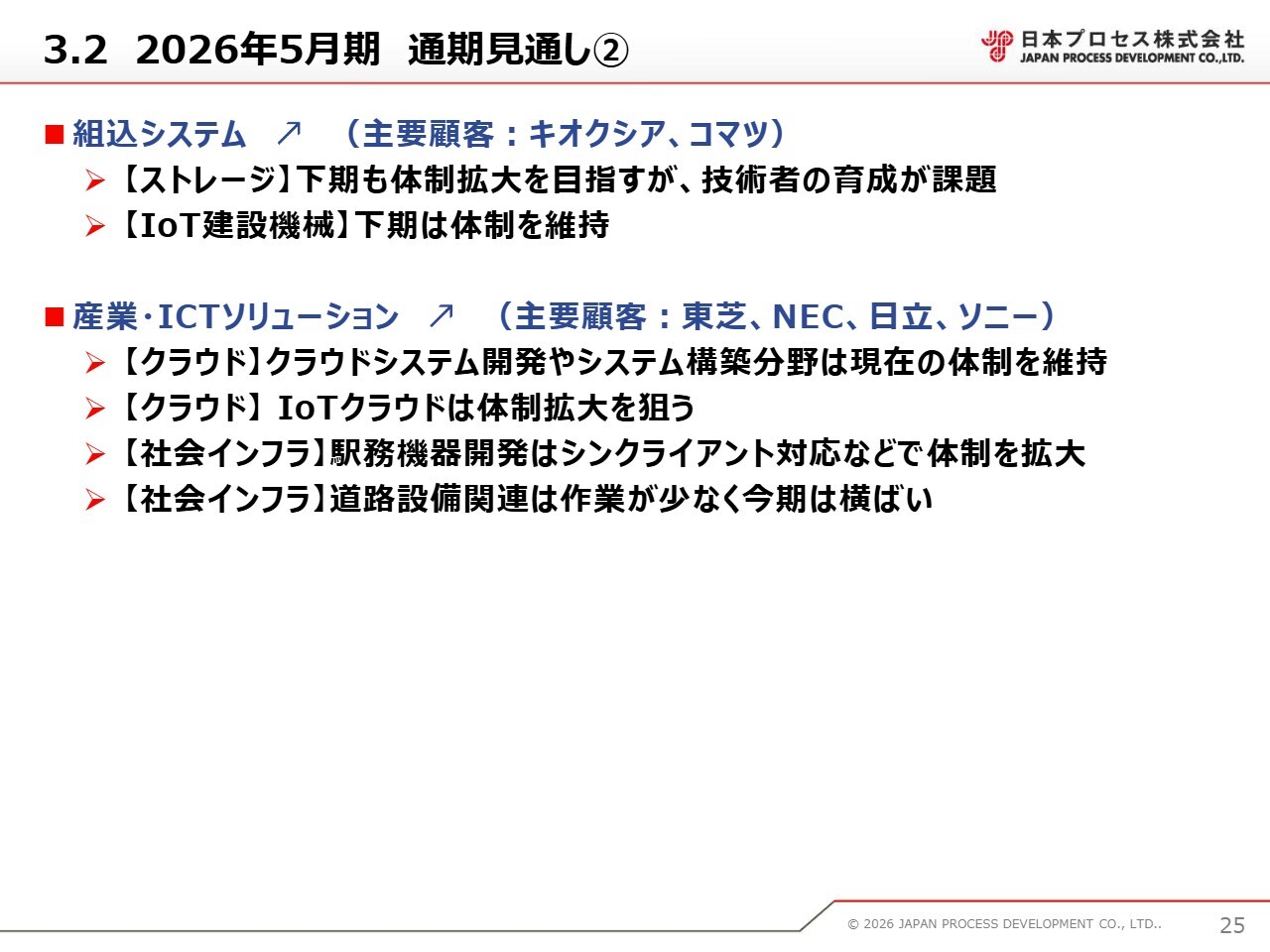 社会インフラ分野では、駅務機器の開発においてシンクライアント対応などで、体制を拡大します。また、道路設備関連は作業が少なく、今期は横ばいとなる見込みです。