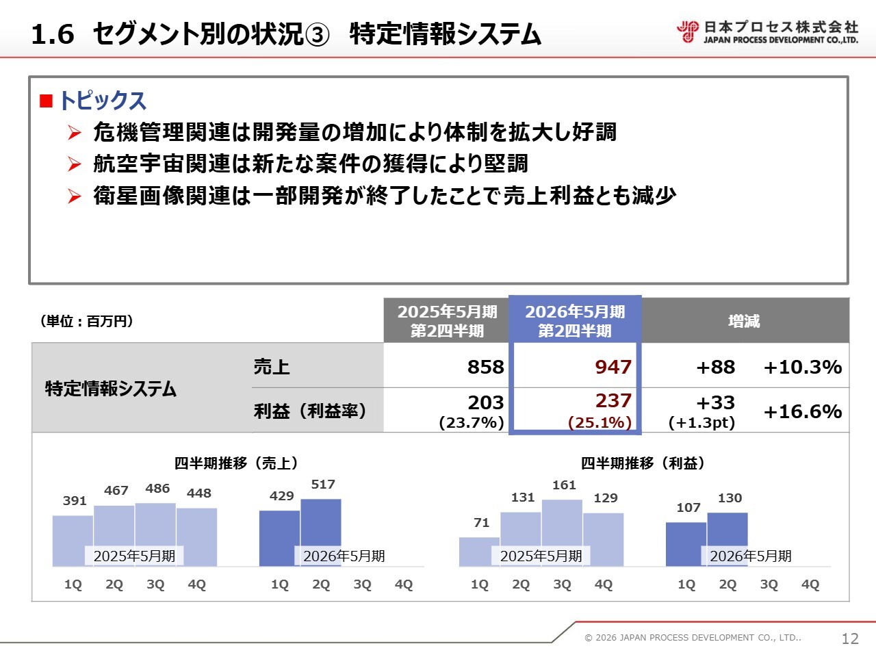 特定情報システムです。危機管理関連は、開発費の増加により、体制を拡大しました。航空宇宙関連は、新たな案件の獲得により、堅調でした。衛星画像関連は、一部開発の終了により売上・利益ともに減少しました。