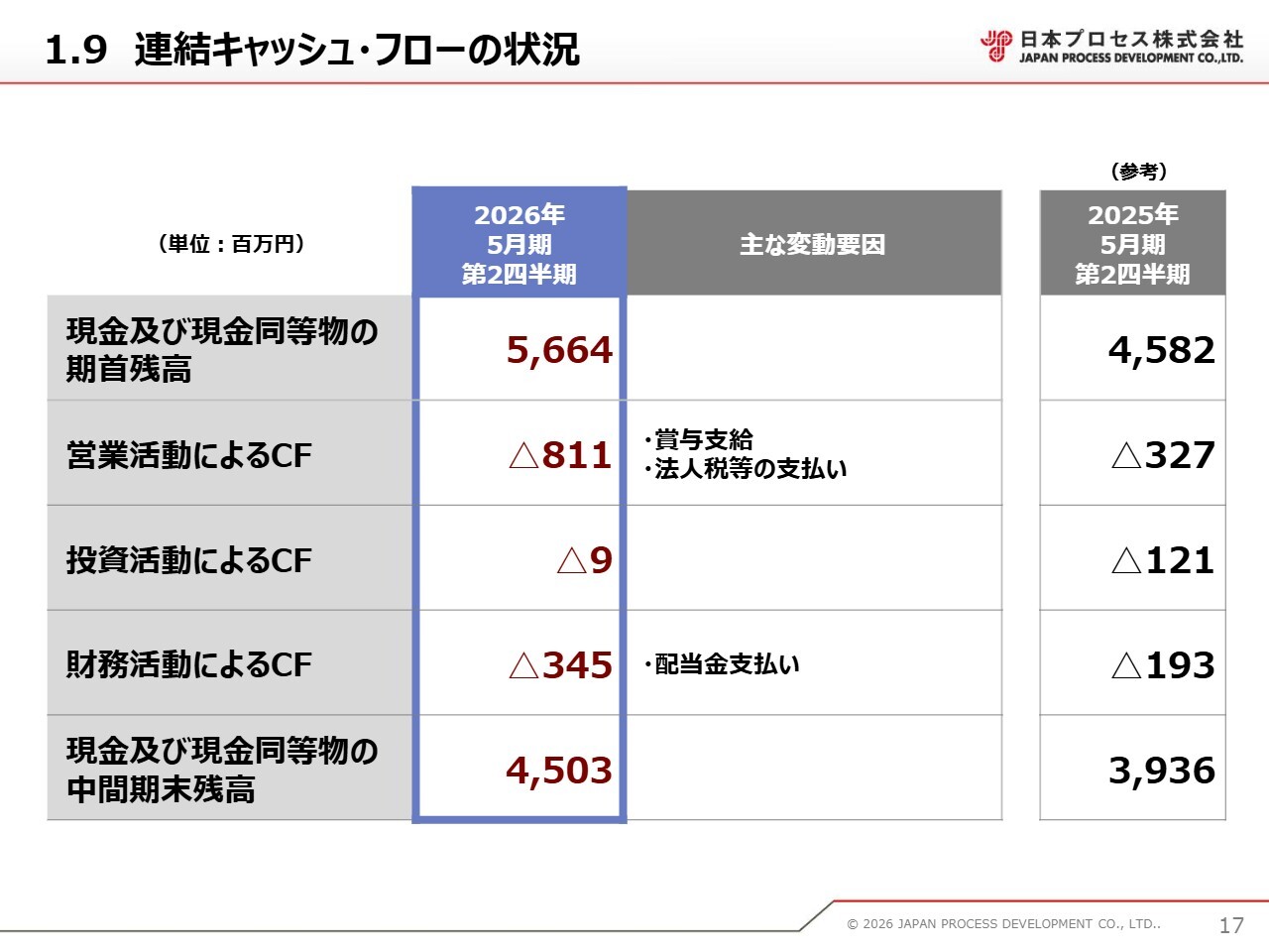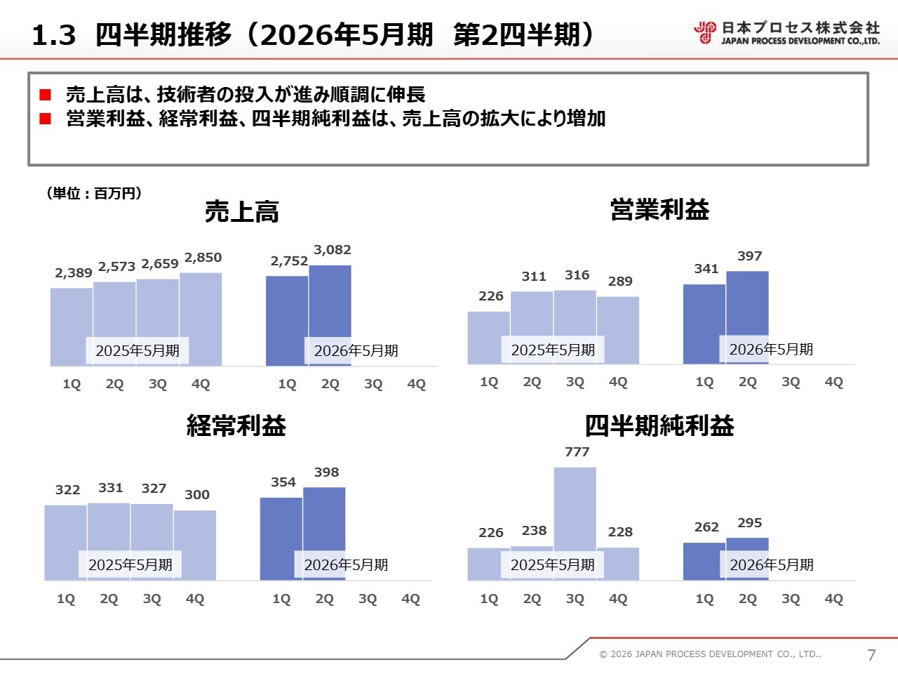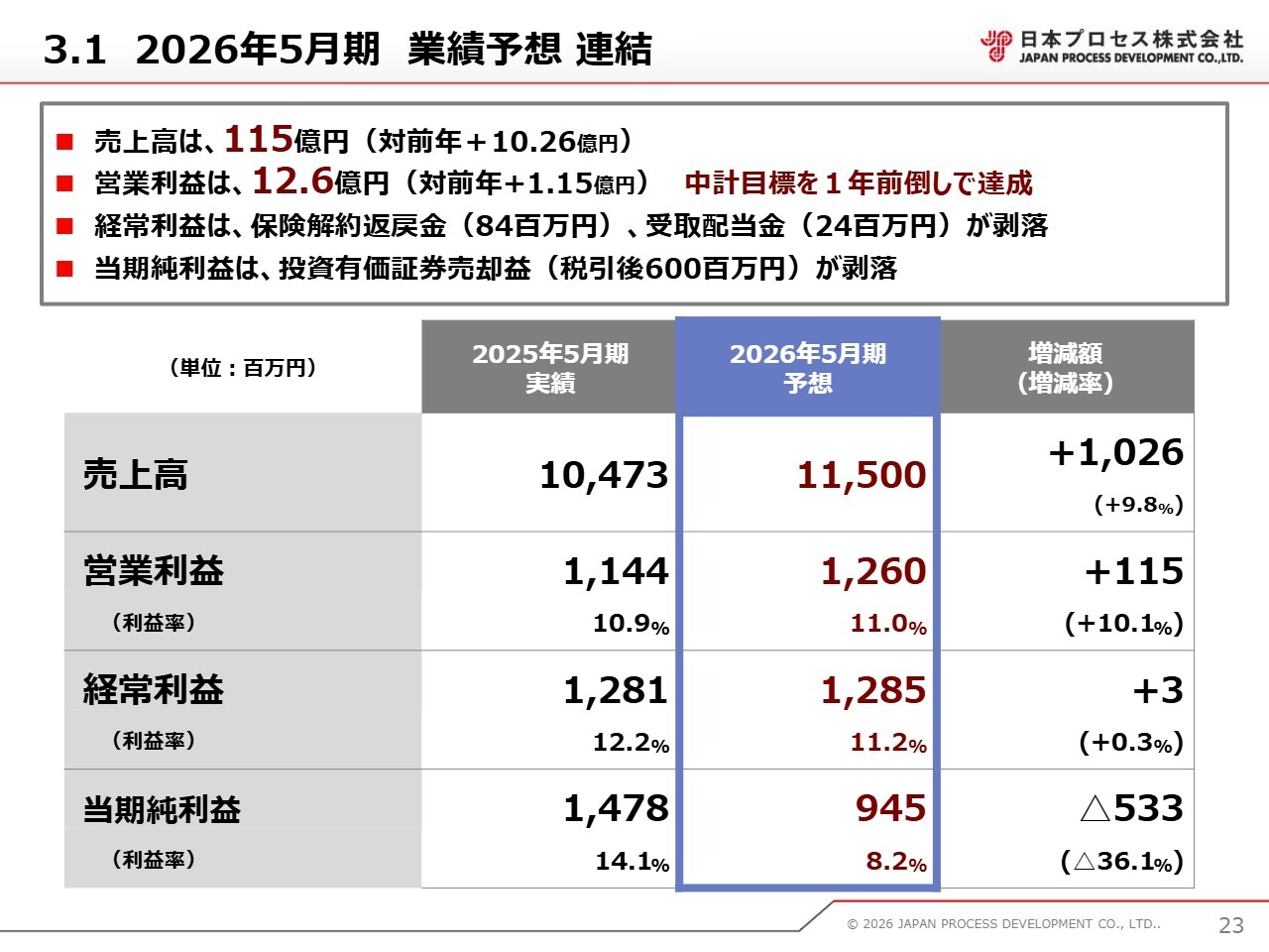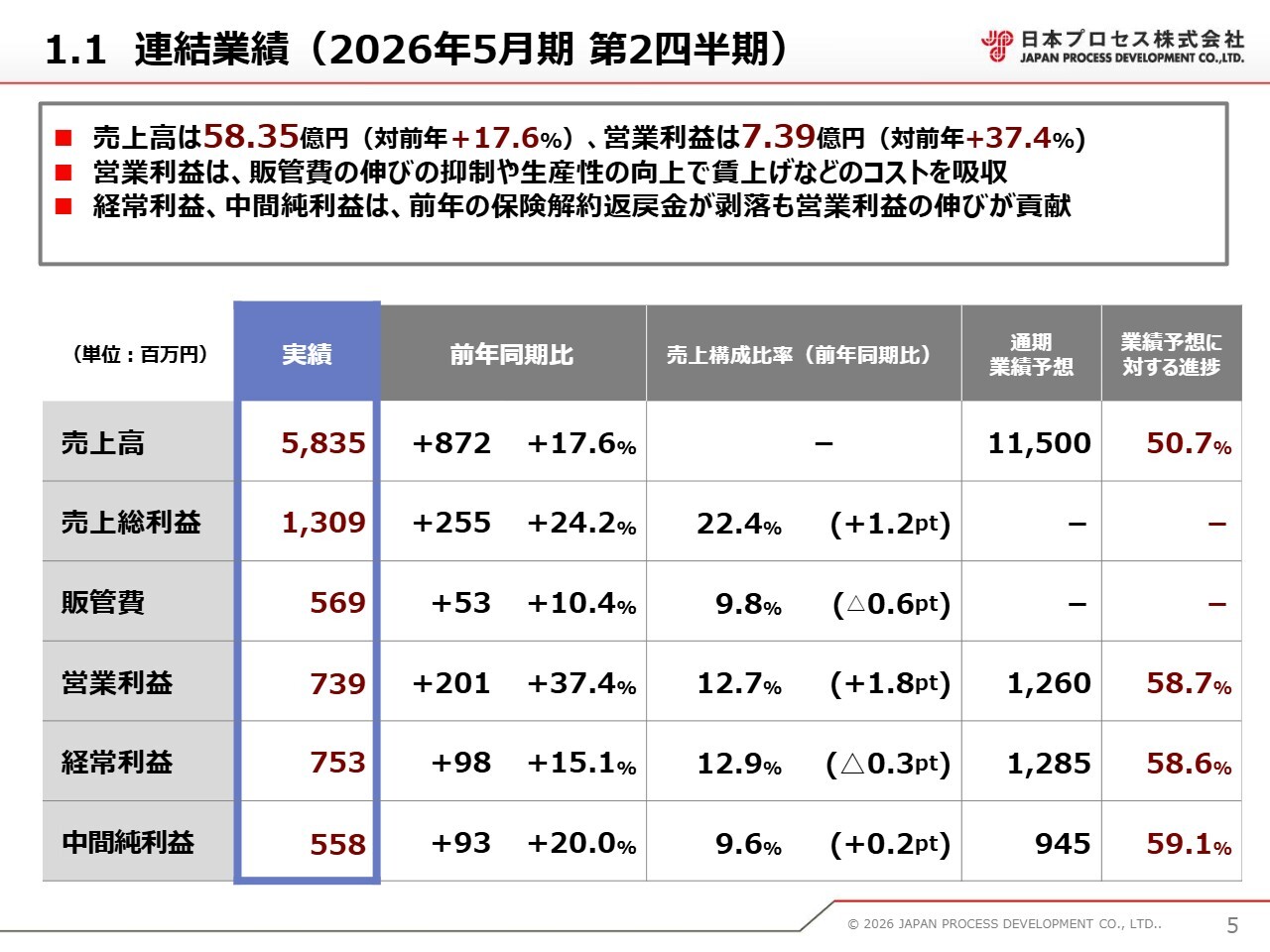 東智氏(以下、東):日本プロセス株式会社代表取締役社長の東です。本日はよろしくお願いします。最初に2026年5月期の第2四半期連結決算について、次に中期経営計画の取り組みについて、最後に2026年5月期の見通しについてご説明します。