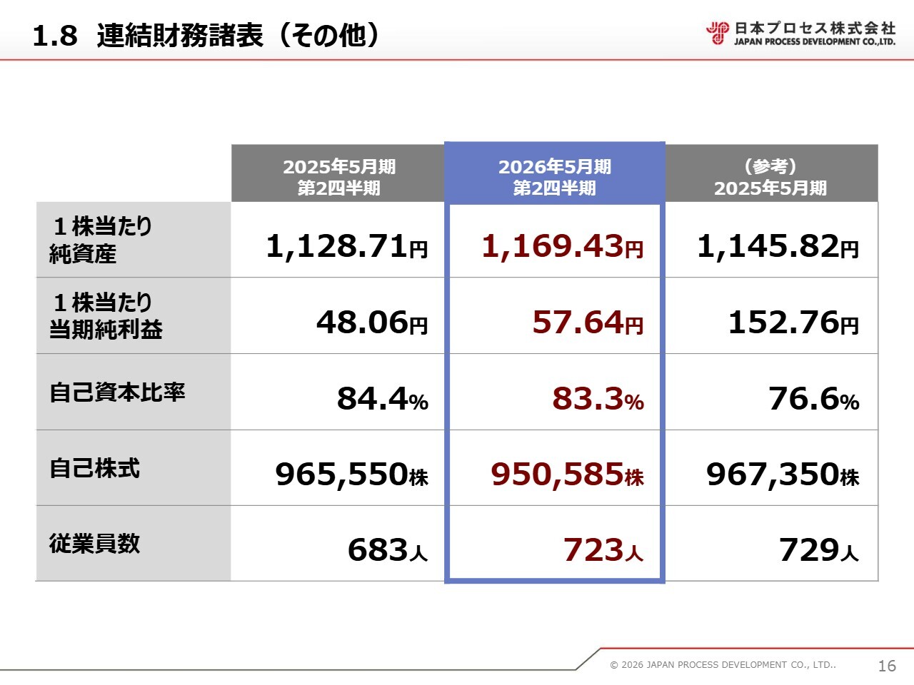 1株当たりの情報や自己資本比率などについては、スライドのとおりとなります。