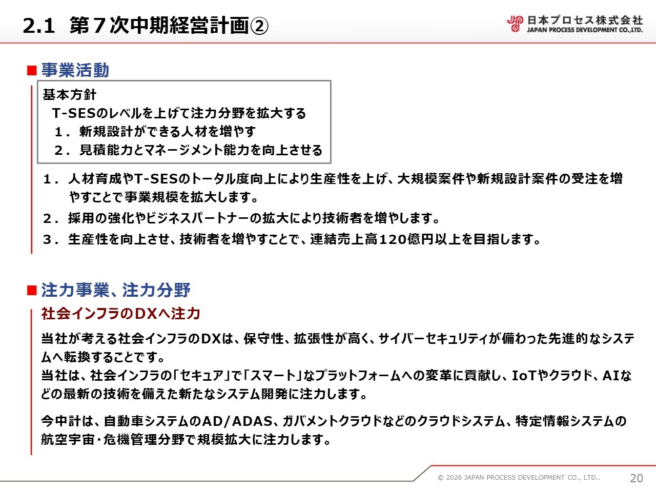第7次中期経営計画は、継続して人材育成を進めることで生産性を高め、新規設計案件や大規模案件の受注を増やすことで、前中期経営計画を上回る成長を目指します。