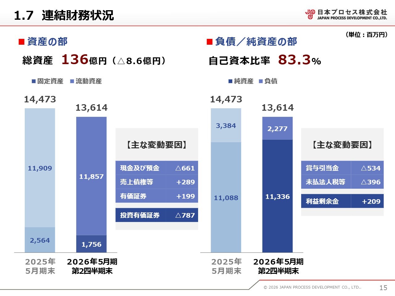 連結財務状況です。総資産は136億円、自己資本比率は83.3パーセントとなりました。資産の部では、流動資産については、賞与支給および法人税等の支払いに伴い、現金および預金が減少しました。固定資産については、投資有価証券が減少しました。