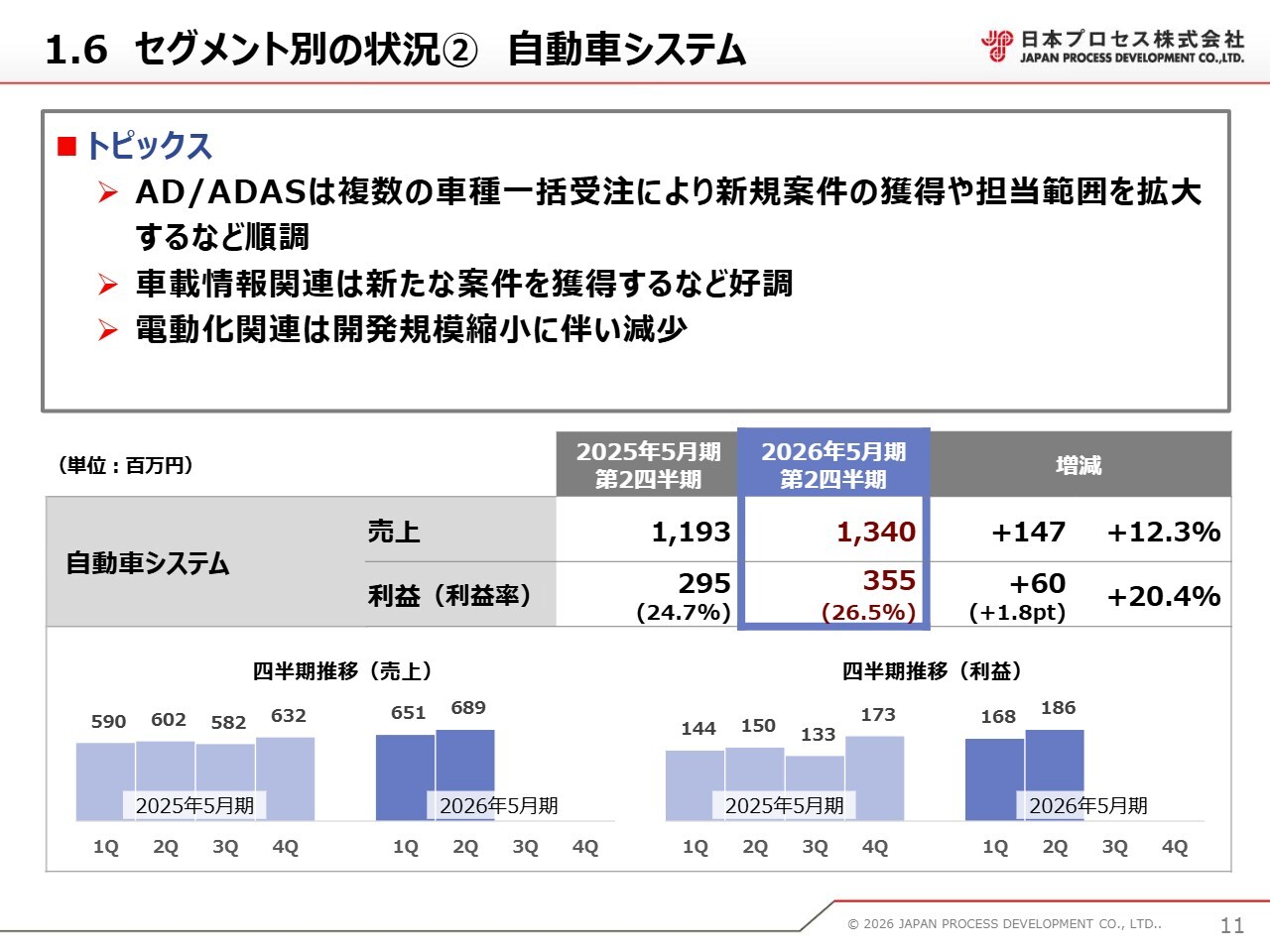 自動車システムです。AD/ADASは、複数の車種一括受注により、新規案件の獲得や担当範囲拡大など、順調でした。