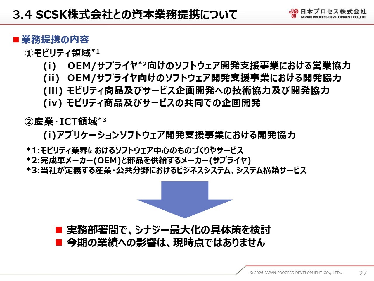 質問者:貴社はSCSK社との提携を、中間期の途中で締結しています。2026年5月期の業績予想には、この提携効果が織り込まれているのでしょうか?