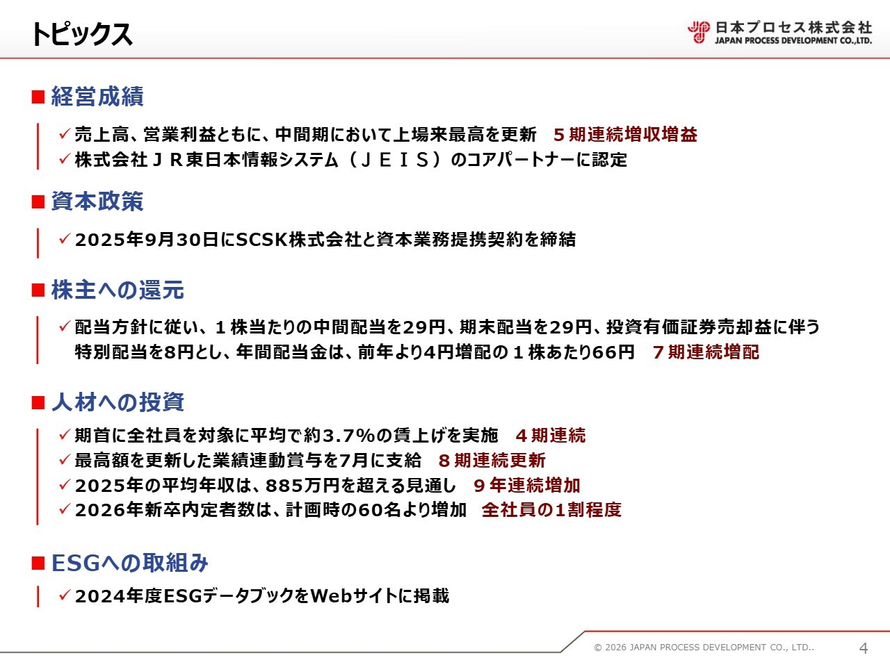 まず、トピックスです。経営成績は、売上高、営業利益ともに、中間期において5期連続で上場来最高を更新しました。また、昨年11月に株式会社JR東日本情報システム(JEIS)のコアパートナーに認定されました。